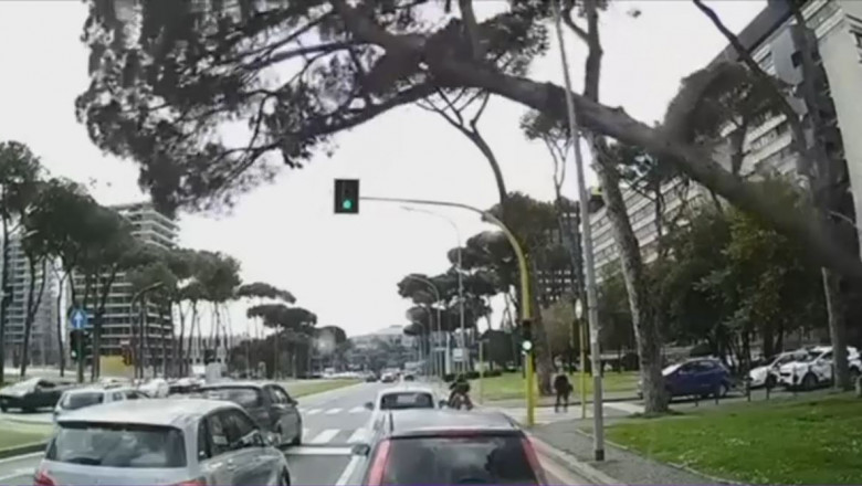 Un copac inalt de peste 15 metri a cazut peste mai multe masini care asteptau la semafor în capitala Italiei. Un roman se afla si el în coloana si a surprins incidentul cu ajutorul camerei de bord.